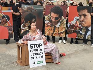 We wanted to make this clear during the protest and therefore a fallera played the main role in our protest. The falleras are women dressed in beautiful traditional dresses. They are the face of the Fallas. In our protest, a fallera was given the role of a victim of bullfighting, bloodied and surrounded by banners with images of bullfighters who are about to kill a bull.