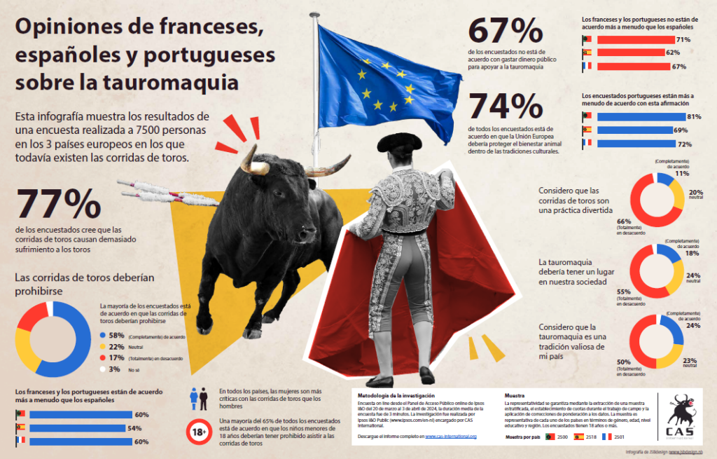 La encuesta, realizada a 7.500 personas por Ipsos I&O Public por encargo de CAS, muestra además que una gran mayoría de los ciudadanos de los tres países europeos en los que aún se celebran corridas de toros opina que no debería gastarse dinero público en apoyar la tauromaquia y que la Unión Europea debería proteger el bienestar de los animales dentro de las tradiciones culturales.